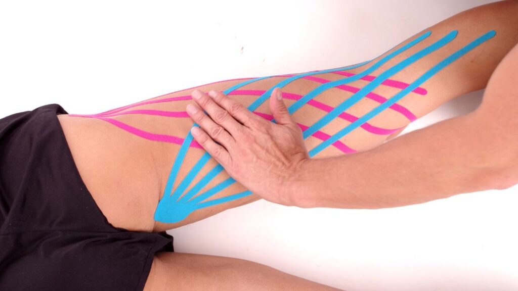 В качестве дополнительного метода может применяться кинезиотейпирование. Наложение тейпов позволяет частично снизить нагрузку на повреждённые мышцы, улучшить микроциркуляцию и уменьшить выраженность болевого синдрома. При этом важно понимать, что тейпирование не является самостоятельным методом лечения, а используется как вспомогательный инструмент в составе комплексной терапии и реабилитации.