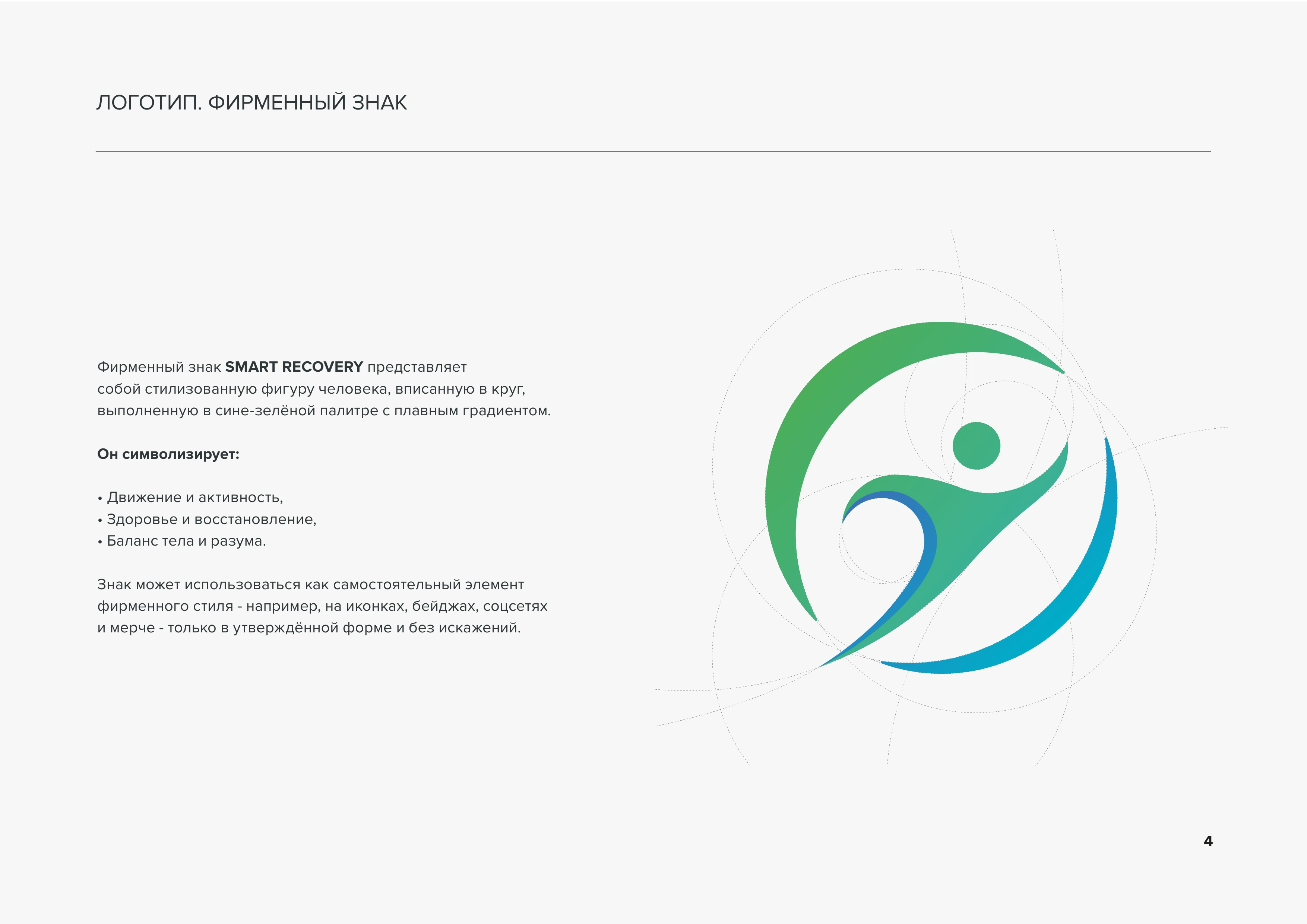Логотип. Фирменный знак Описание фирменного знака SMART RECOVERY - стилизованная фигура человека в круге с сине-зелёной палитрой и плавным градиентом стр. 4
