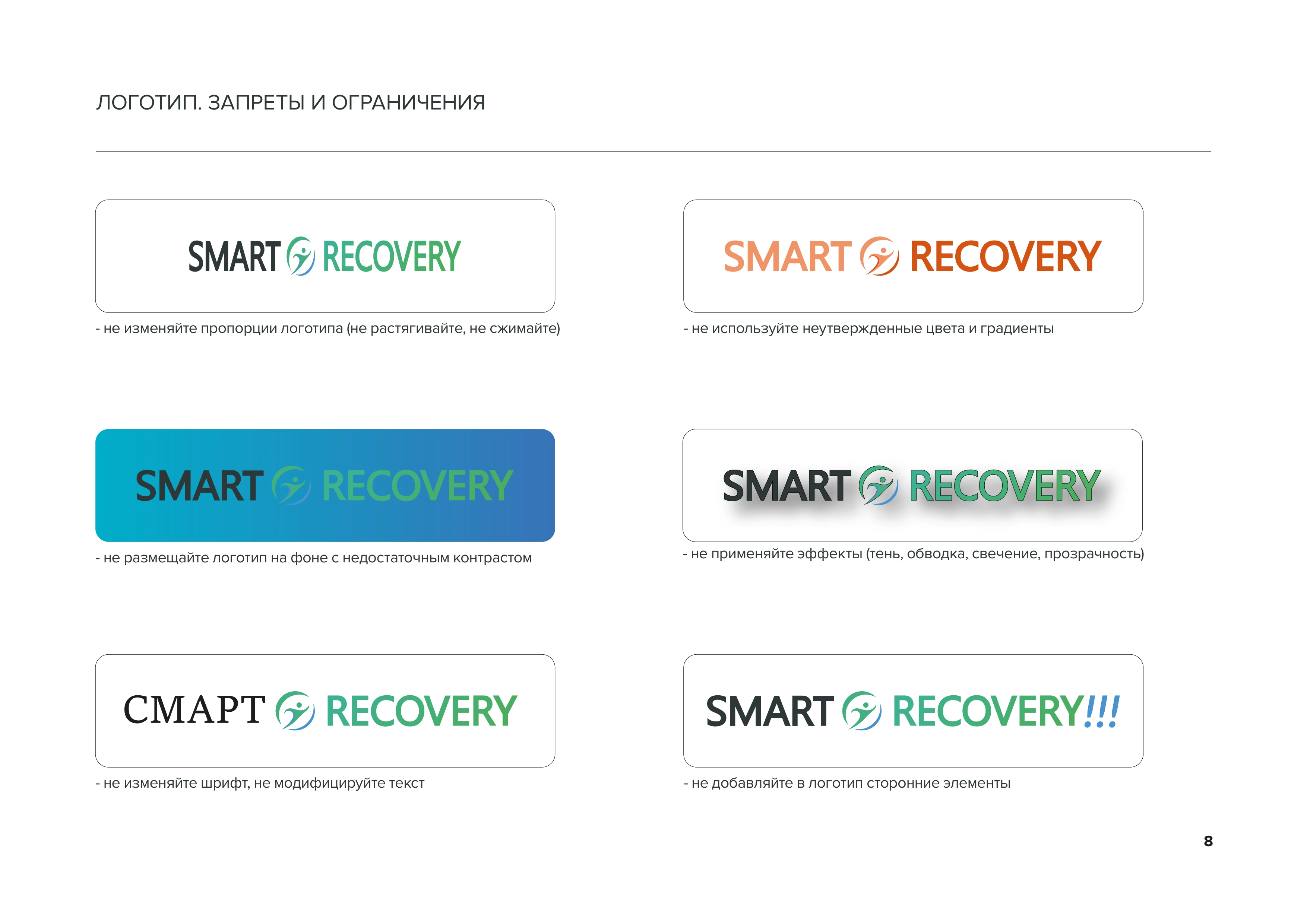 Логотип. Запреты и ограничения Правила использования логотипа: не изменять пропорции, не использовать неутверждённые цвета и градиенты, не размещать на пёстром фоне, не применять эффекты стр. 8