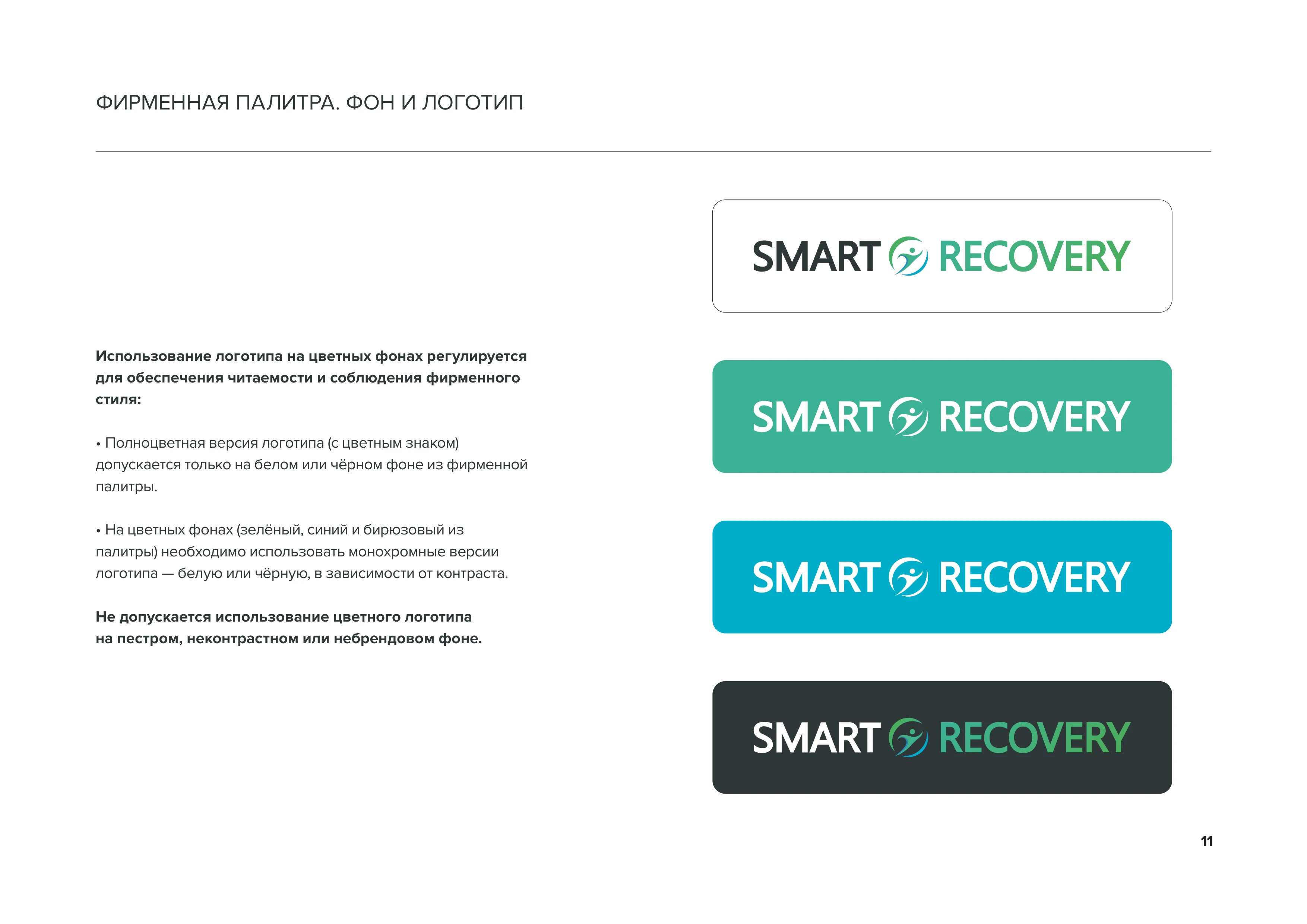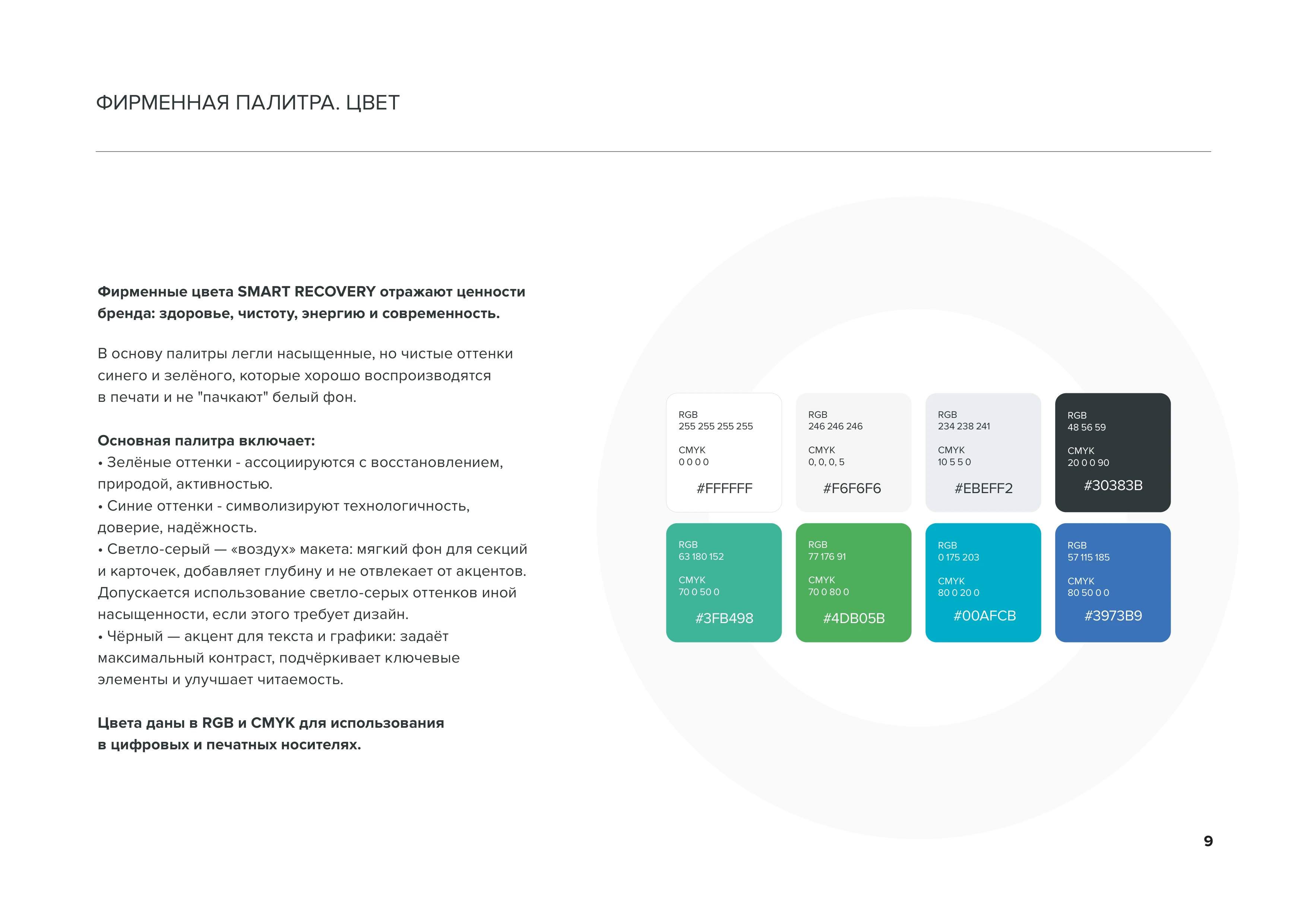 Фирменная палитра. Цвет Фирменные цвета SMART RECOVERY отражают ценности бренда: здоровье, чистоту, энергию и современность. Основная палитра включает зелёные, синие оттенки и тёмно-серый цвет стр. 9