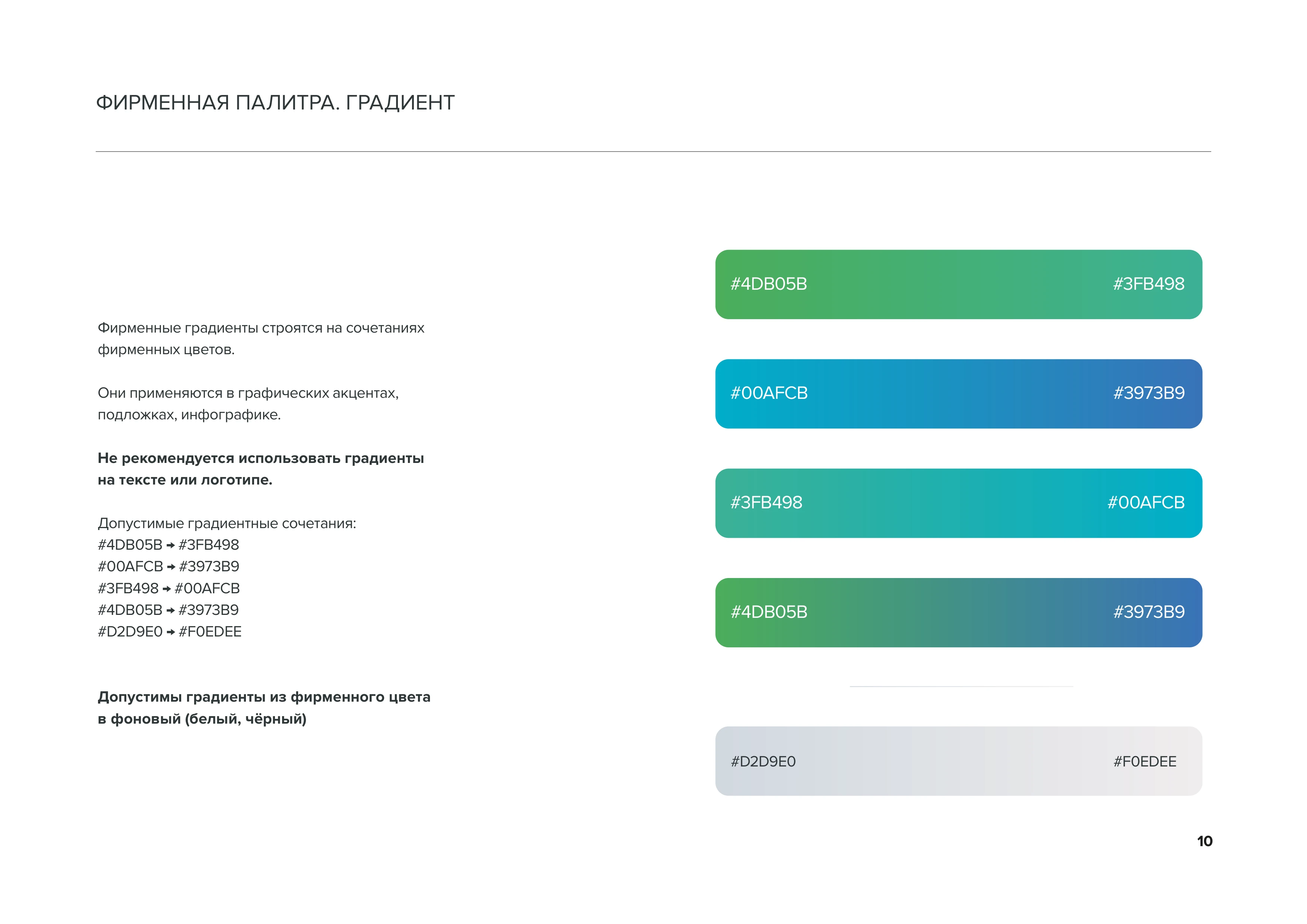 Фирменная палитра. Градиент Фирменные градиенты строятся на сочетаниях фирменных цветов. Применяются в графических акцентах, подложках, инфографике. Не рекомендуется использовать на тексте или логотипе стр. 10