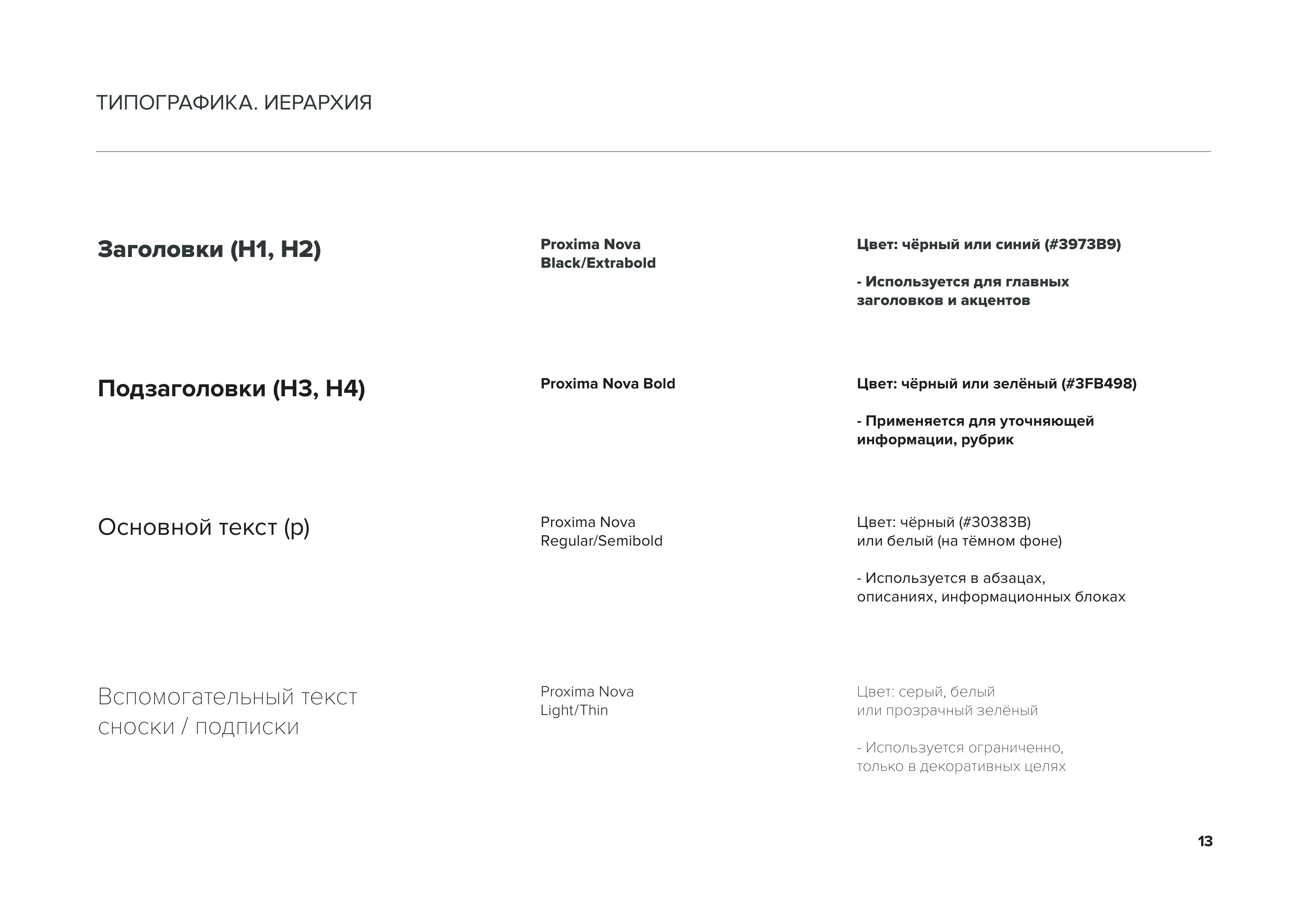 Типографика. Иерархия Иерархия заголовков: H1-H2 - Proxima Nova Black/Extrabold для главных заголовков, H3-H4 - Proxima Nova Bold для подзаголовков, основной текст - Proxima Nova Regular/Semibold стр. 13