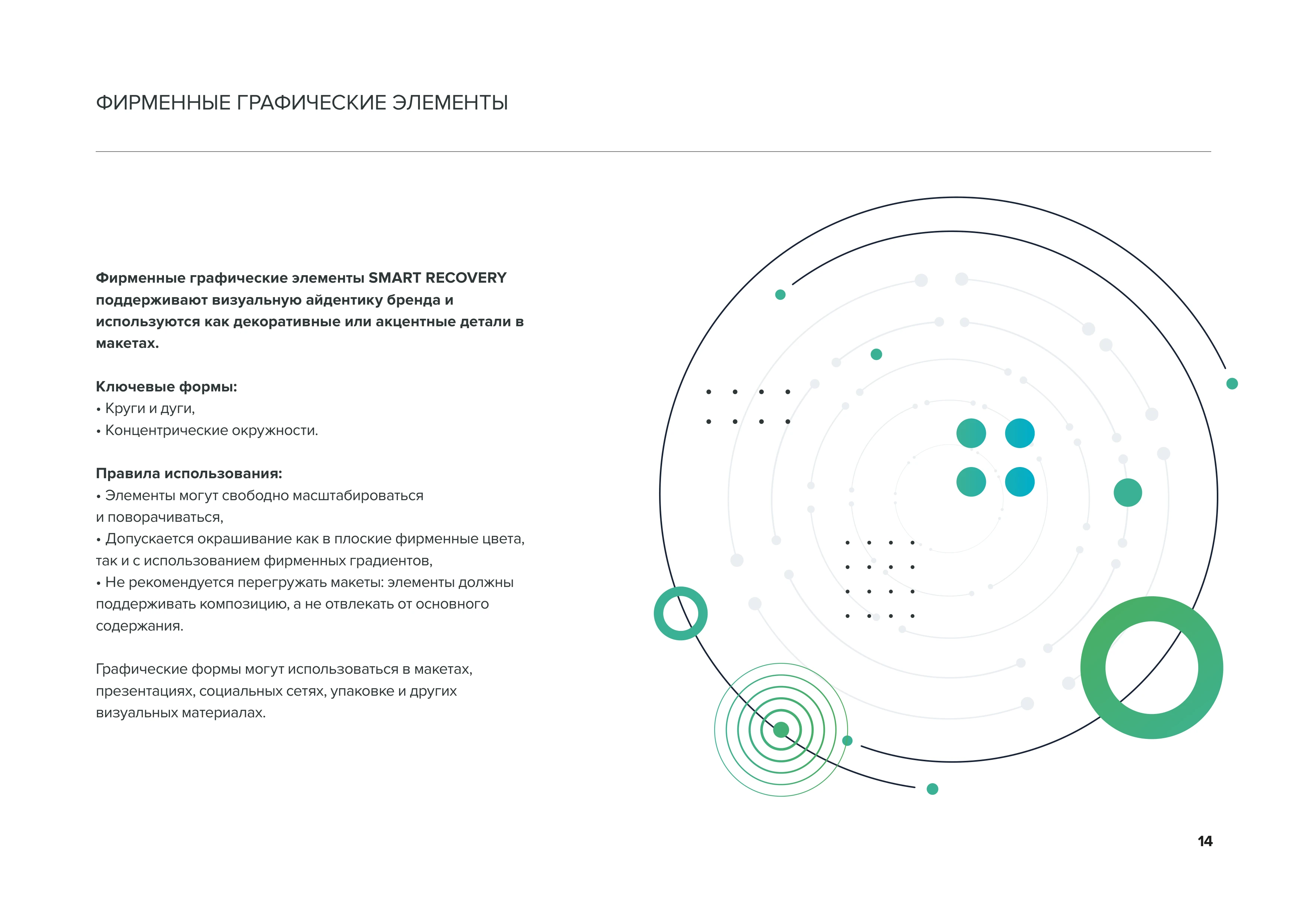 Фирменные графические элементы Фирменные графические элементы SMART RECOVERY поддерживают визуальную айдентику бренда: круги, дуги, концентрические окружности. Используются как декоративные элементы в макетах стр. 14