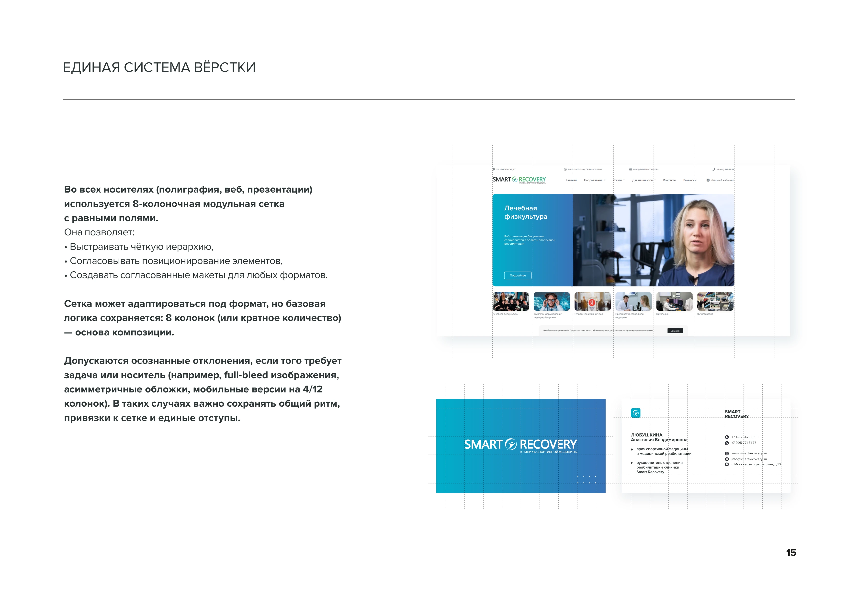 Принципы разработки макетов. Комбинации цветовых блоков Все макеты SMART RECOVERY выстраиваются на основе 8-колоночной модульной сетки. Это обеспечивает структурность, визуальный порядок и единый ритм на всех носителях: от полиграфии до цифровых интерфейсов стр. 16