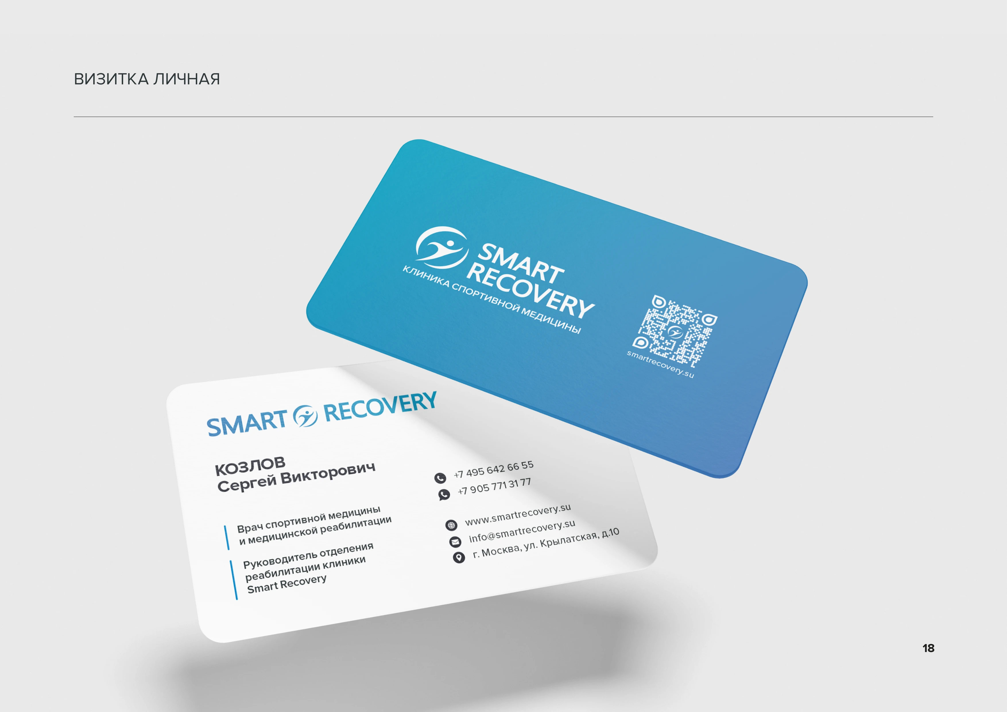 Визитка личная Личная визитка сотрудника с градиентным фоном в фирменных цветах. Включает логотип, персональную информацию, должность и контактные данные клиники стр. 18