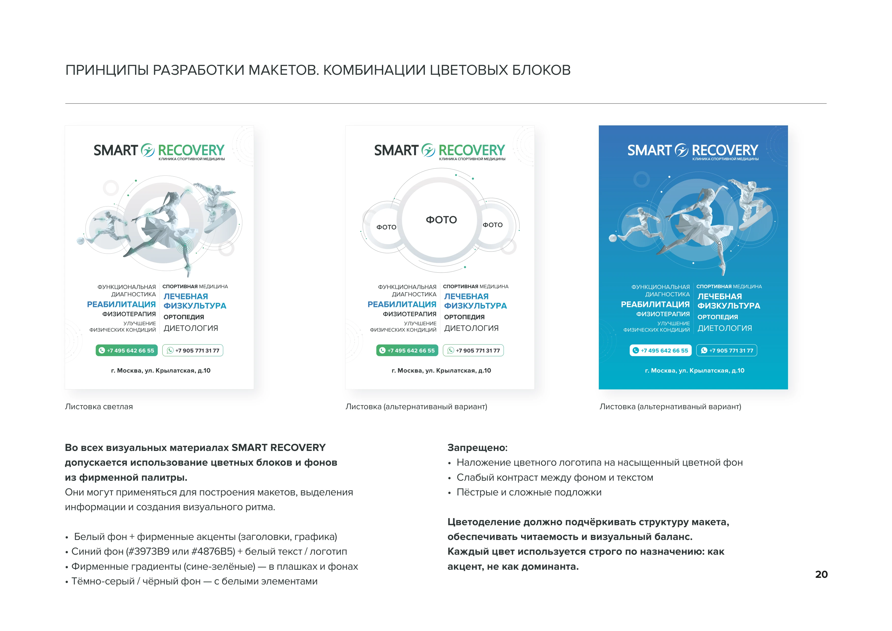 Принципы комбинации цветовых блоков Правила сочетания фирменных цветов в макетах. Показаны примеры листовок с различными цветовыми решениями: белый фон с цветными акцентами, синий градиент и тёмно-серый фон стр. 20