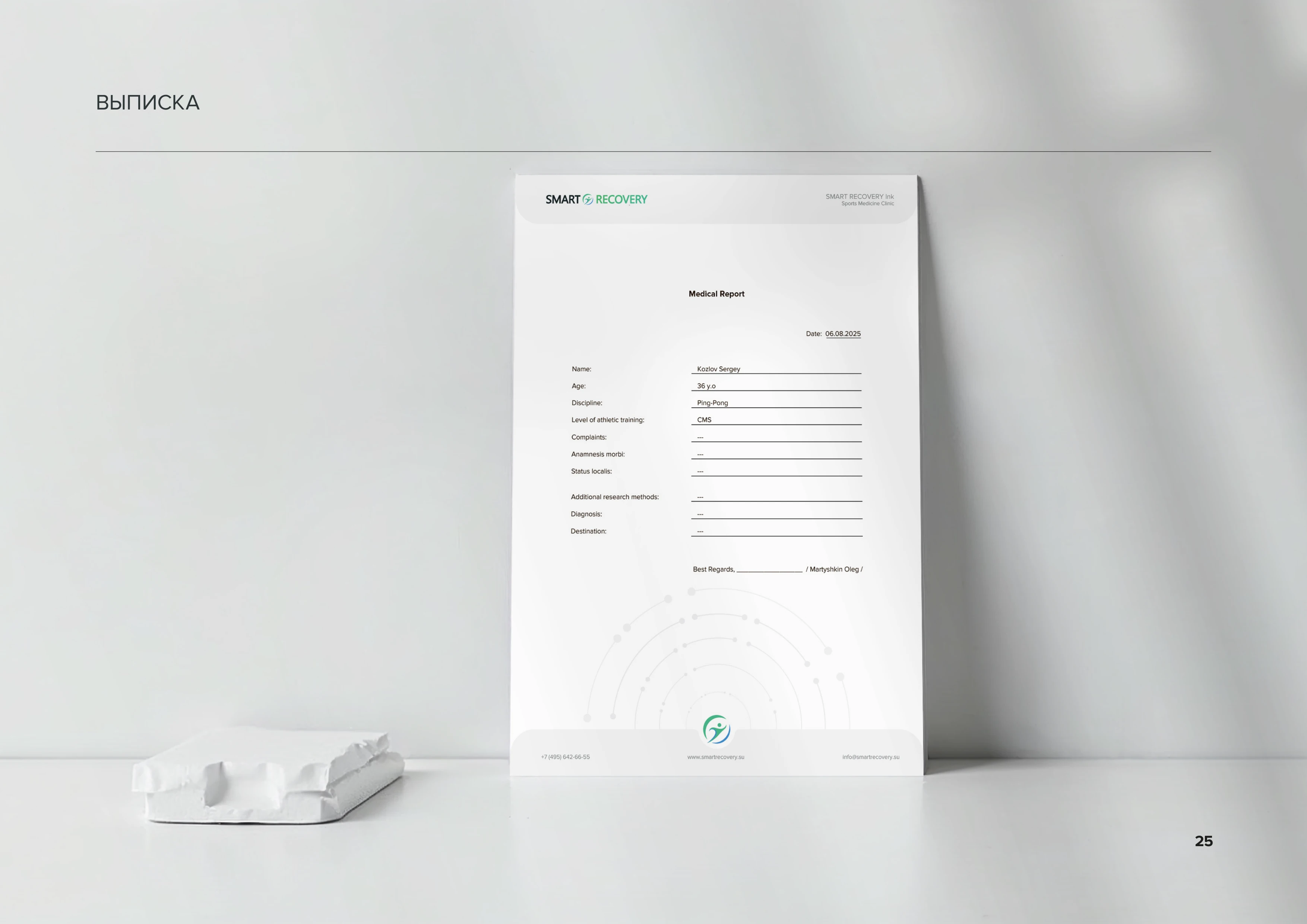 Выписка Медицинская выписка с фирменным оформлением. Содержит поля для внесения медицинской информации, логотип клиники и структурированный макет для удобства заполнения врачами стр. 25