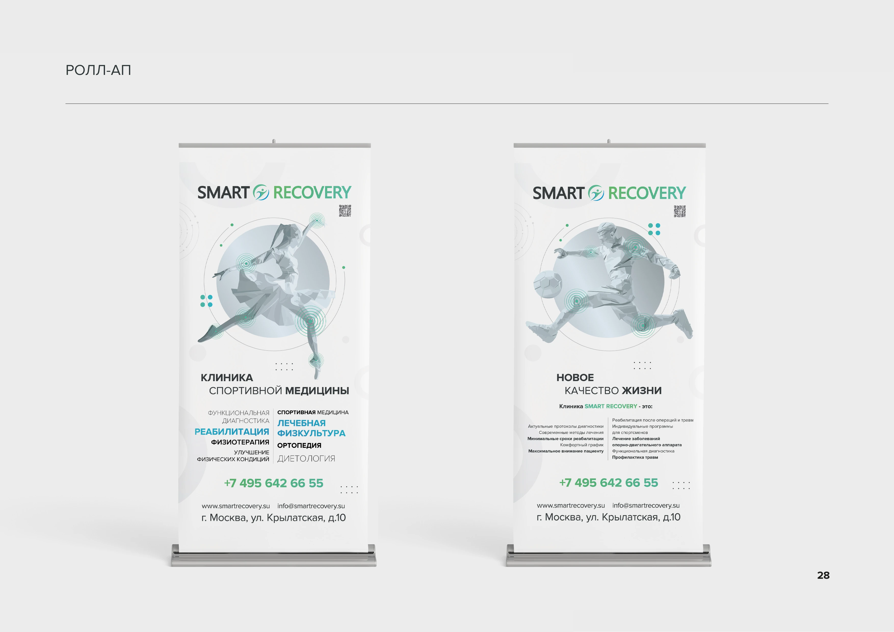 Задняя обложка Завершающая страница брендбука с крупным логотипом SMART RECOVERY, фирменным знаком бегущего человека, QR-кодом для быстрого доступа к сайту и контактной информацией клиники стр. 28